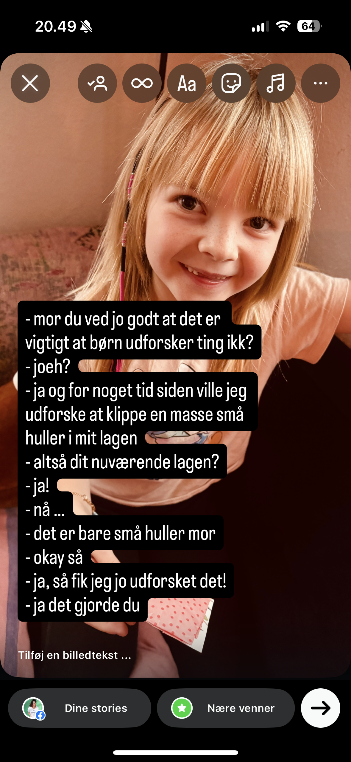 Jeg deler ikke for at starte en diskussion, jeg deler ikke pga noget politisk. Jeg deler sådan en lille historie fordi jeg synes børnehjerner er fuldstændig magiske, fordi jeg synes det er en inspirerende børnemåde at tackle en “ups’er” på, jeg deler fordi jeg altid skriver sjove/spændende/tankevækkende samtaler med mine børn ned, og jeg deler fordi denne lille samtale er af fragment af en verden jeg synes alle fortjener at leve i. Jeg vil gerne selv blive bedre til at eje mine fuck-ups uden skam, men derimod under dække af at jeg “udforskede” noget. Jeg synes det er pisseklogt, langt mere klogt end selvudslettende voksen-undskyldninger, hvor vi skal skamme os ihjel over et eller andet vi er kommet til at ødelægge eller fucke op.