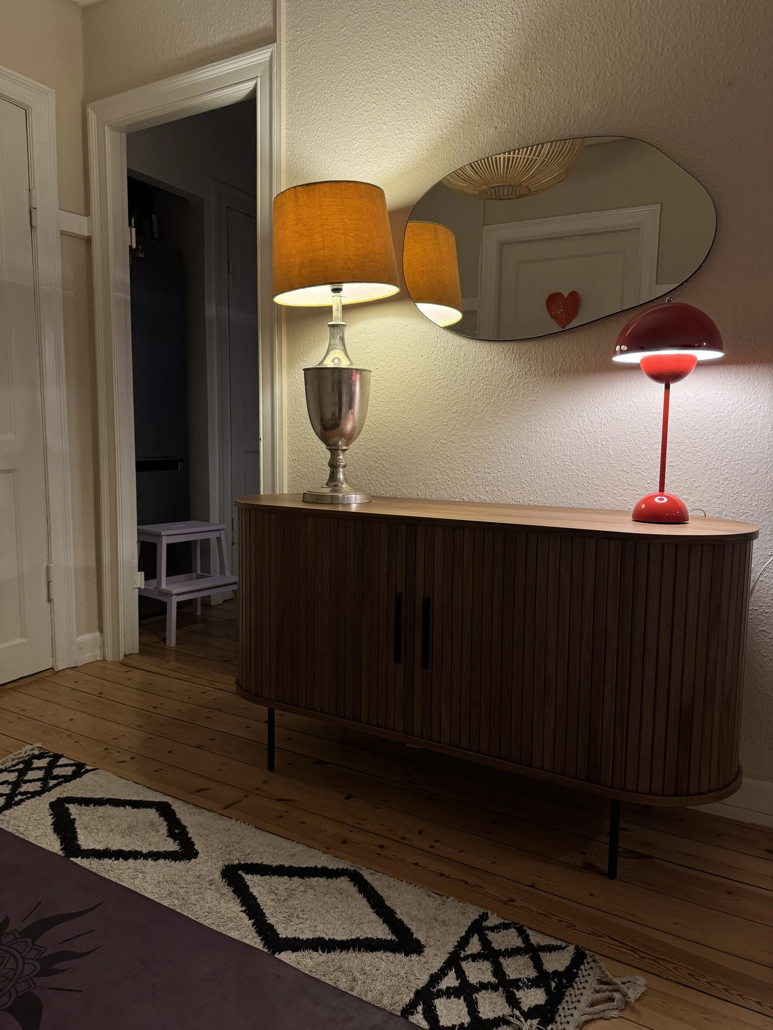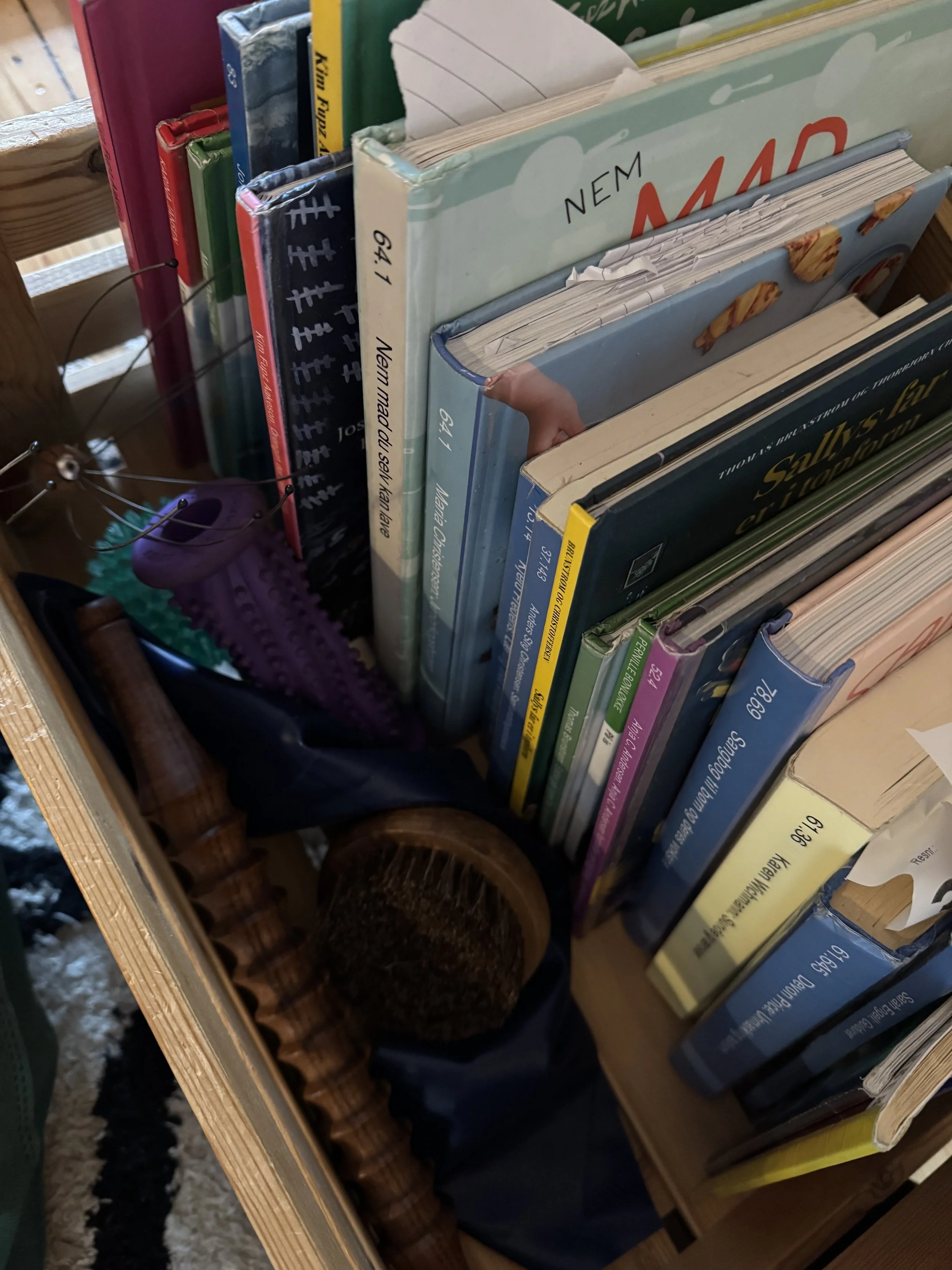Det første jeg gjorde da jeg kom hjem efter workshoppen, var at indrette vores relativt store entre til “sanserum”. Jeg laver i forvejen yoga i entreen, men jeg sørgede for at ændre belysningen til noget mere blødt lys (det kan man gøre med pærer eller lamper, jeg rullede min yogamåtte ud på gulvet og jeg hentede vores sanse-legetøj (bolde, massageruller og elastikker mm.) og lagde dem ud i den bogkasse vi allerede har stående i entreen.